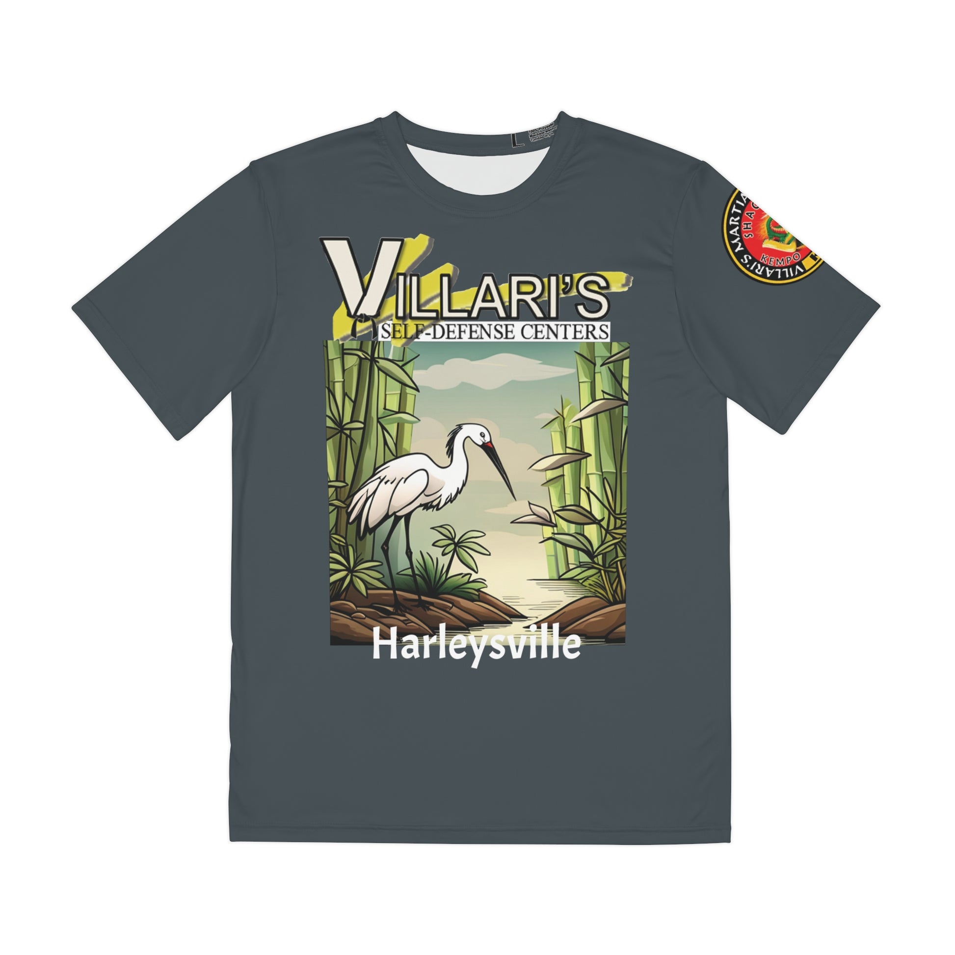 Wear this Crane in a Bamboo Forest shirt while balancing life and karate. This is a 100% moisture-wicking polyester shirt. This tees is stretchy, durable, and delivers total comfort.
